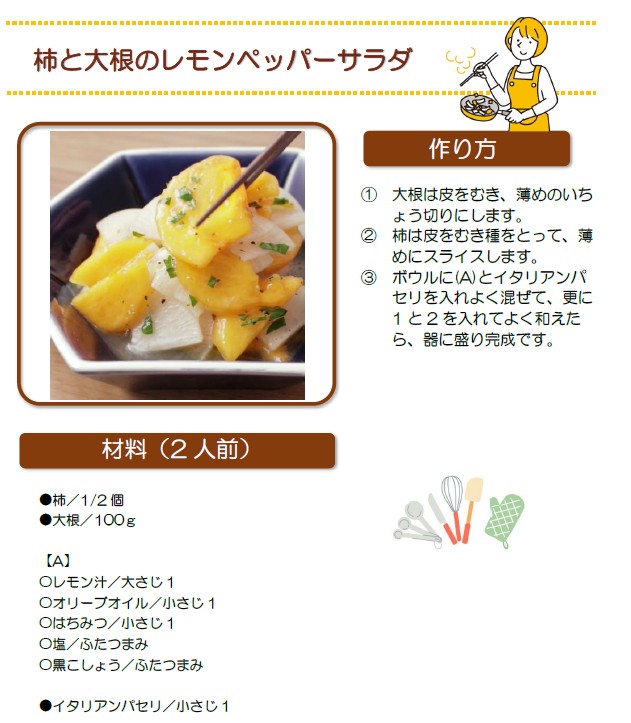 柿には非常に多くの栄養が含まれています。 そのうちの一つであるビタミンCには、免疫力を高め風邪を引きにくくする働きがあります。 その含有量はミカンの2倍にもなり、柿1個で1日分の必要量に相当します。 また、血圧を下げる働きのあるカリウムや、コレステロールを下げる働きのある食物繊維も豊富に含まれています。気温が低くなり、風邪をひきやすい季節になりますので、今から免疫力を高めて風邪をひかないよう心掛けましょう!