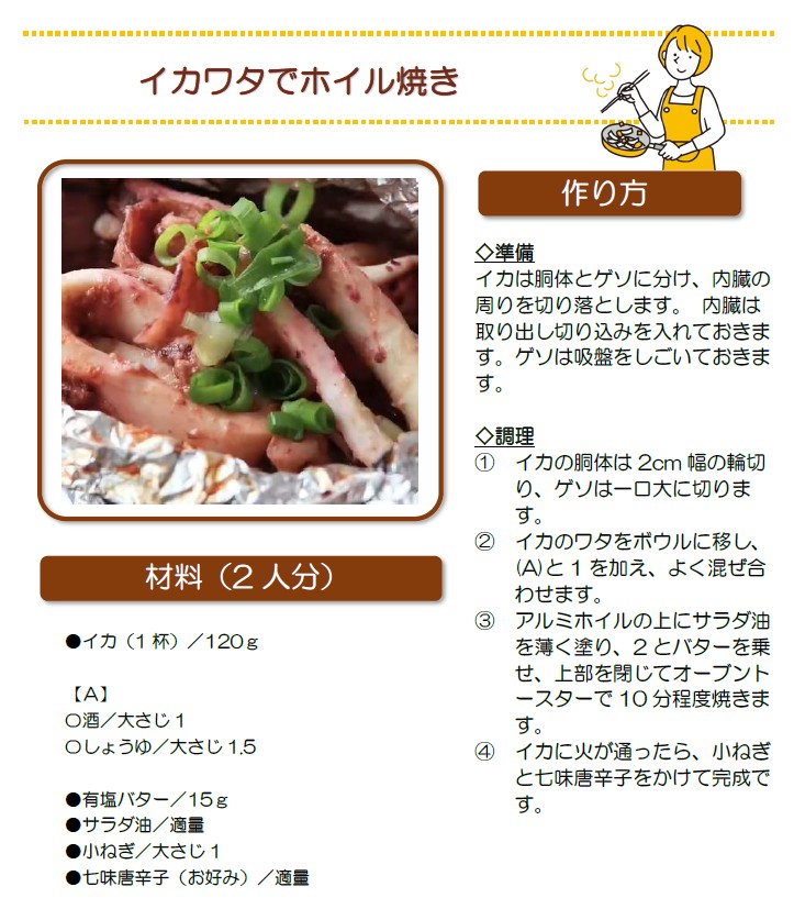 イカには良質なたんぱく質が多く含まれ、脂質が少ないのが特徴です。イカのコレステロール含有量は、魚介類のなかでも多い方ですが、一方で、体内でコレステロールを減らす作用があるタウリンを豊富に含んでいます。タウリンには、そのほか心臓や肝臓の機能を高める、視力の回復、インスリン分泌促進、高血圧の予防、中性脂肪を減らすなど、さまざまな効果があると言われています。