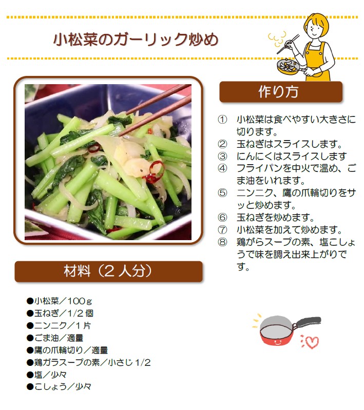 小松菜には、疲労回復や免疫力を高めるカロテンやビタミンCが含まれています。 さらに、骨や歯の健康に役立つカルシウムも豊富で、その量はほうれん草の3倍、牛乳並みの量が含まれている栄養満点の野菜です。子どもにも高齢者にもおすすめの食材です!