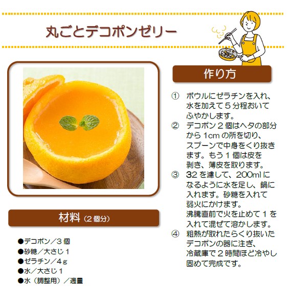 デコポンは、清見オレンジとポンカンの交配品種の一種「不知火(しらぬい)」のうち、糖度13.0度、酸度1.0度以下などの厳しい基準をクリアしたものに付けられる名称です。ビタミンCはみかんの約1.6倍。クエン酸もたっぷりで疲労回復におすすめです。