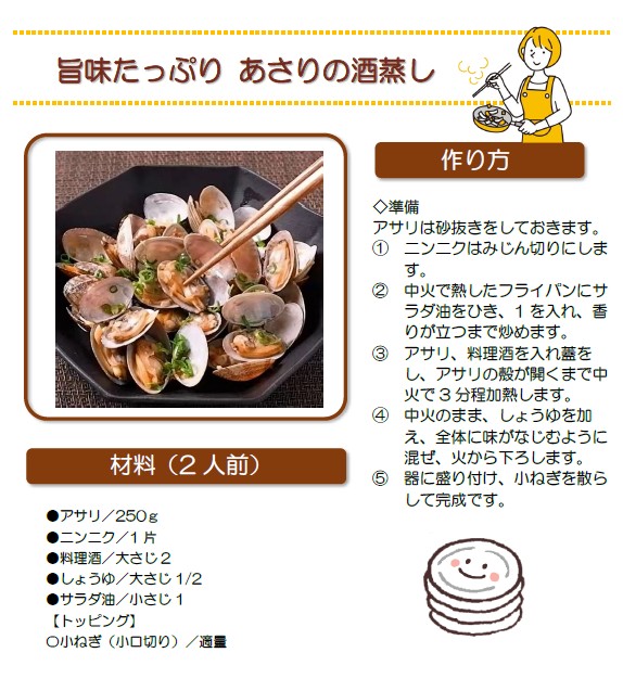 あさりには貧血を予防するビタミンB12や鉄分、骨や歯を強くするカルシウムが豊富。うまみ成分のタウリンやコハク酸も豊富に含まれています。 あさりの高い栄養価は、私たちの健康や美容もサポートしてくれます。しかしあさりには塩分が多いので、高血圧予防の観点から、殻付き50g(7個程度)が良いでしょう。