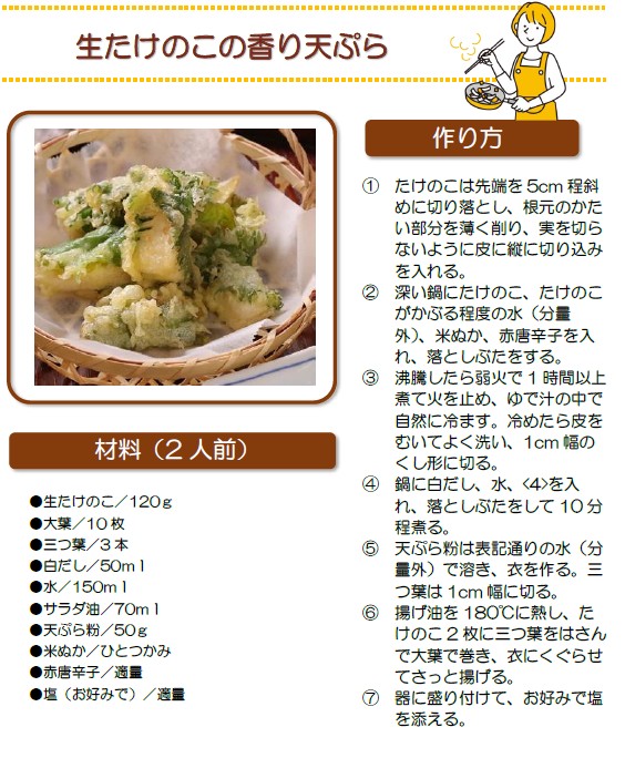 たけのこの栄養としては、食物繊維が豊富で腸内環境を整えるとともに、コレステロールの吸収を抑 える働きが期待できます。また、野菜類の中ではたんぱく質を多く含み、うま味のもとであるアミノ酸 の一種、グルタミン酸やチロシン、アスパラギン酸が含まれています。たけのこの切り口に白い粒や粉 がついていることがありますが、あれはチロシンが結晶化したものであるため、取り除く必要はありません。